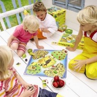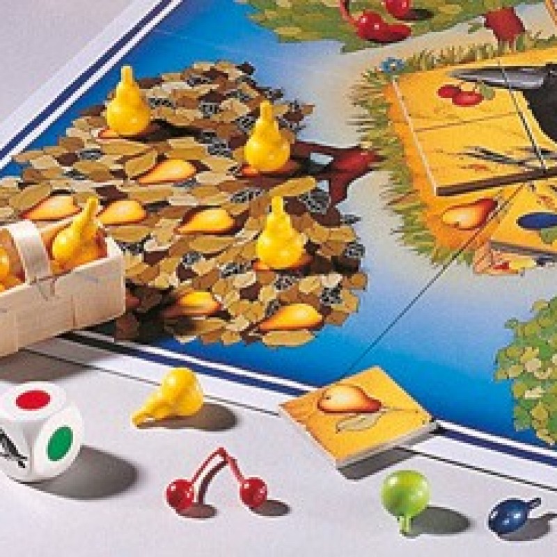Wie zal er winnen.......... de stoute raaf of de goed samenwerkende kinderen? De 40 gekleurde houten vruchten, de echte mandjes van spaan en het felgekleurde speelbord met kinderlijke voorstellingen, geven een extra stimulans aan het spel.