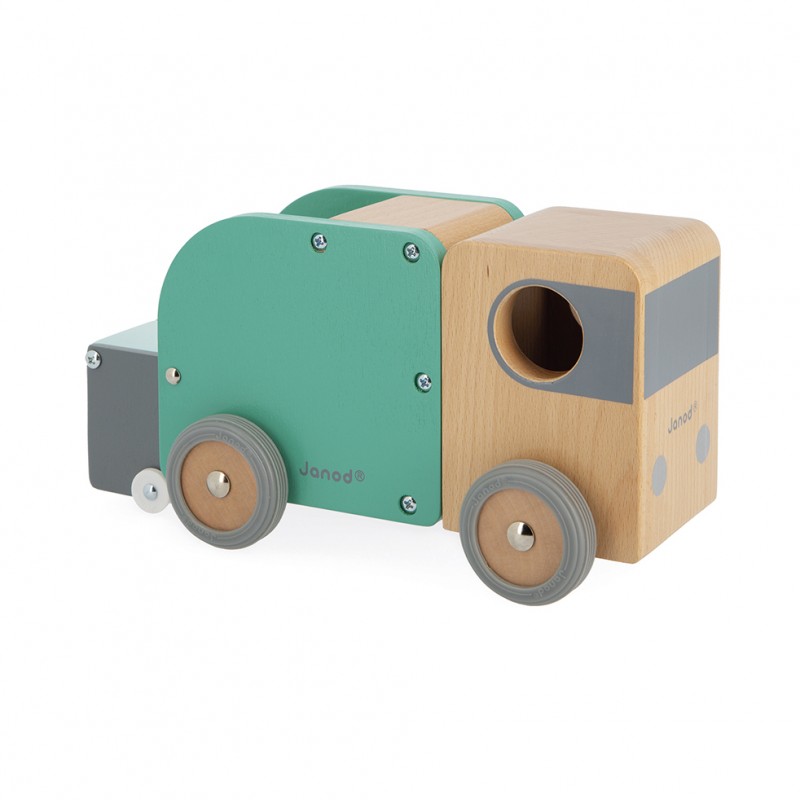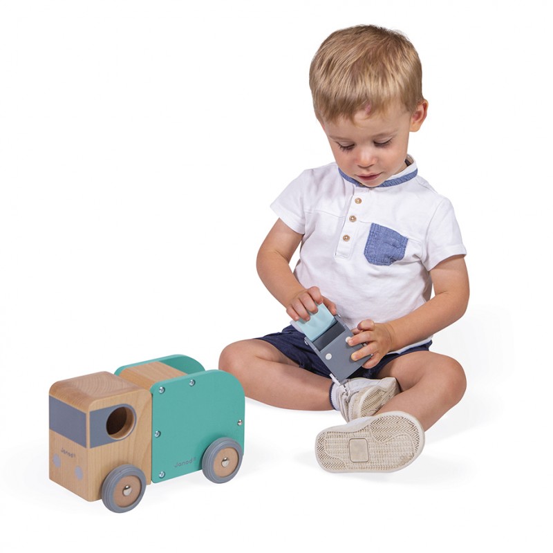 Een leuke houten vuilniswagen om uw kind van kleins af aan bewust te maken van ecologie en recycling. Deze vrachtwagen is voorzien van een vuilnisbak met magneten aan de achterkant. Deze kantelt en opent om de inhoud te legen, net zoals in het echt! De vrachtwagen beschikt over perfect stille, rubberen wielen. Perfect om de fijne motoriek en verbeelding te ontwikkelen. Speelgoed van massief FSC TM hout en waterverf. Ontwikkelingsspeelgoed voor kinderen vanaf 2 jaar.
