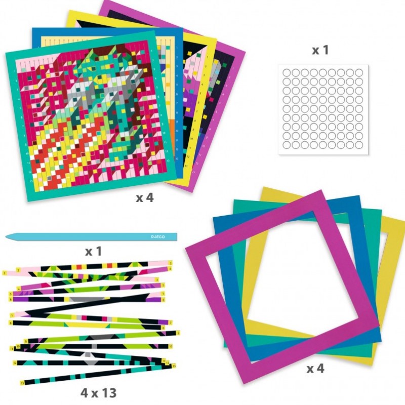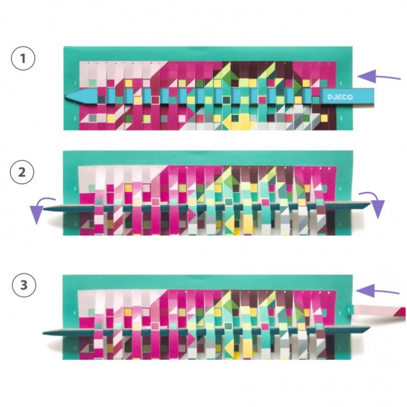 Een weefdoos met papieren stroken om 4 "pixel art"-schilderijtjes te maken. Met behulp van het hulpmiddel schuift het kind de papieren stroken in het gedeeltelijk bedrukte en genummerde raster. Stapje voor stapje verschijnen er robots, aliens of UFO's!