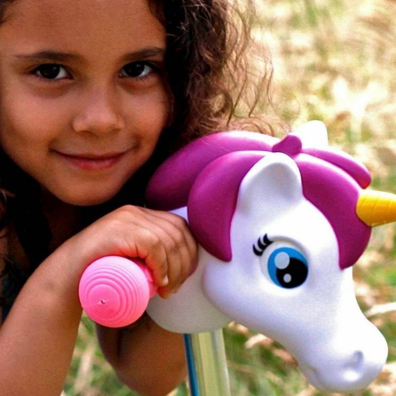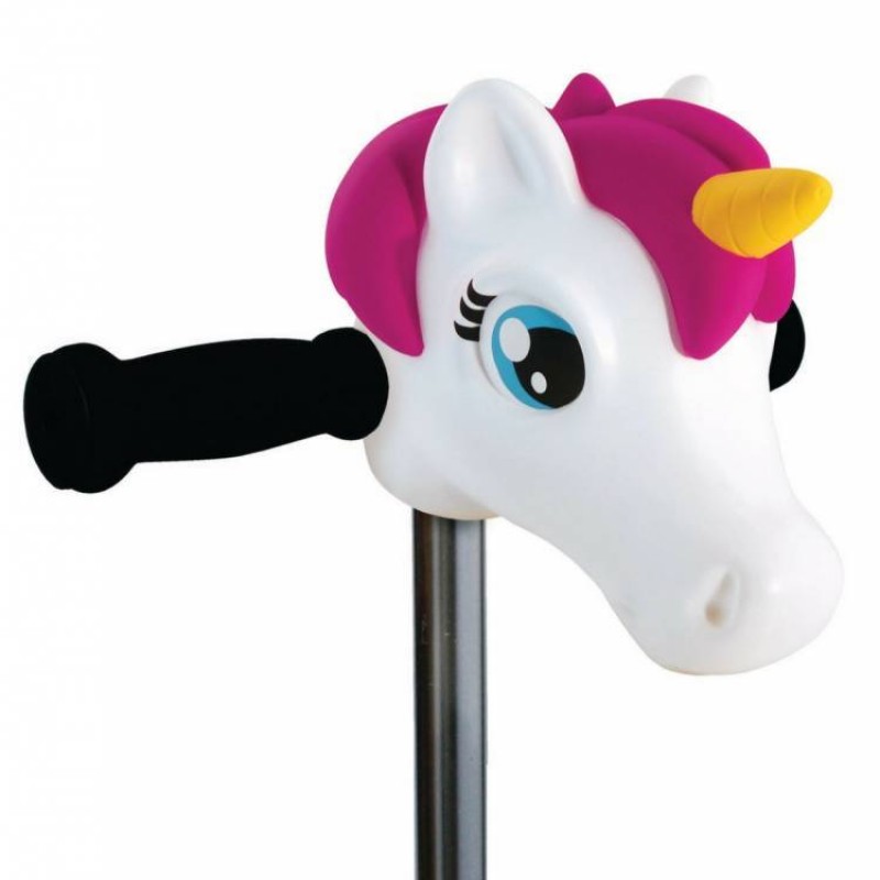 euk scootaheadz eenhoorn hoofd voor op het stuur van je Mini Micro step. Eenvoudige bevestiging. Zacht PVC materiaal. Kinderen hebben veel fanatasie en vinden het leuk om hun step om te toveren in een haai, paard of fantastisch wezen.