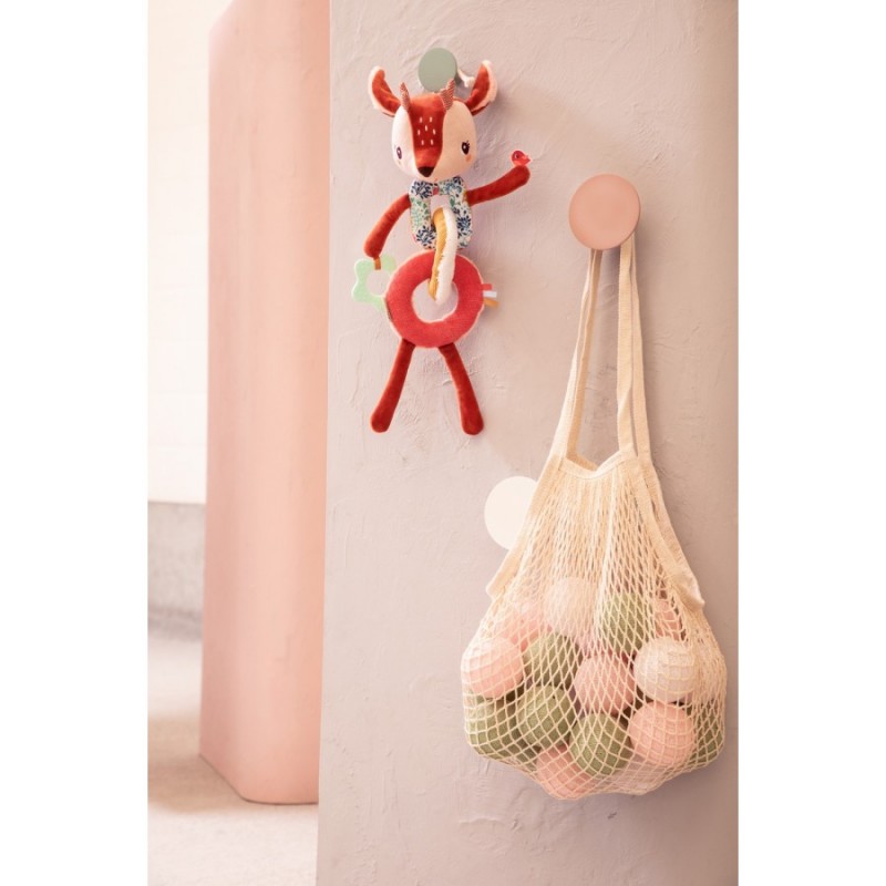 Deze zachte slinger biedt een waaier aan activiteiten die de zintuigen van je kleine uk stimuleren. Rammelende of knisperende geluidjes, verschillende materies, een bijtring… zetten de kleintjes aan om op ontdekking te gaan. De ringen van de slinger kunnen losgemaakt worden. Makkelijk te bevestigen dankzij het touwtje.